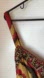 Maxi length, sleeveless, side zip, beaded, v neckline, waist tie, colorful abstract pattern in red, cream, yellow, black, and gold. Vintage Y2K style