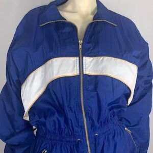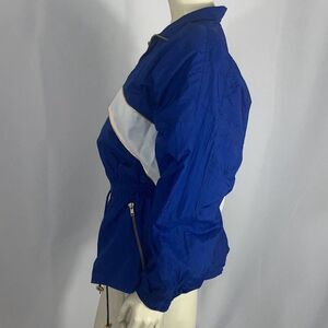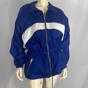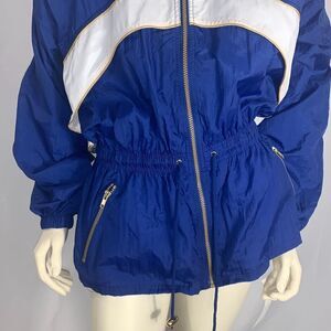 100% nylon full zip vintage windbreaker jacket. Elastic waist with adjustable drawstring. Gold zipper details with side zip pockets. Embroidered star logo back. Oversized balloon sleeves with elastic cuffs, cinched waist with cape back. Full zip to high neck coverage. New attacks. Made in the USA . Nylon mesh lining. Women’s size medium.