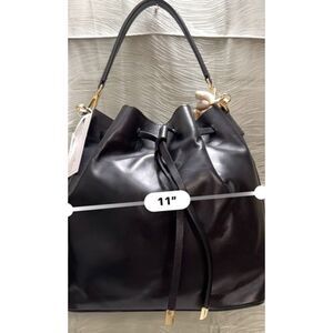 Smooth black leather construction with drawstring closure; drawstrings have gold tips