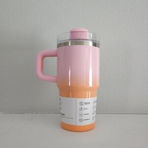 New with tags' Viral Halloween Stanley 20 ounce stainless steel H2.0 flowstate Quencher tumbler featuring a pink gradient to orange bottom base and silver/purple shift holographic bats, stars and moon. Car cup holder compatible, double vacuum insulation and pink/orange matching handle detailing as well as on lid part. keeps ice liquid cold for 30 hours, cold liquid for 8 hours and hot liquid for 4 hours.