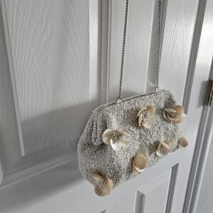 New with tags- Viral Made in India/From India to you white hand made beaded purse with cream color shell flowers, kisslock magnetic frame closure, one interior slip pocket and silver crossbody chain with a 22 inch drop. Purse measures 9.75 in width x 6.25 in height x 3 in depth. Excellent condition with no missing beads.