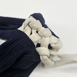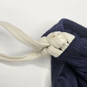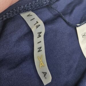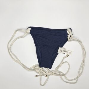 New with tags Vitamin A bikini bottom only size later see pics for verification of size measurements however has flaws on straps has color bleeding from blue onto white straps and some scratches on the faux metal details