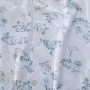White infant sleep gown with button up front by Vitamins Baby. Light blue nursery rhyme themed print.