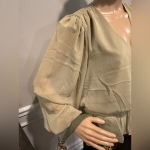 This elegant moss color wrap blouse features a flattering V-neck and long sleeves with smocked cuffs. Perfect for both casual and formal occasions.