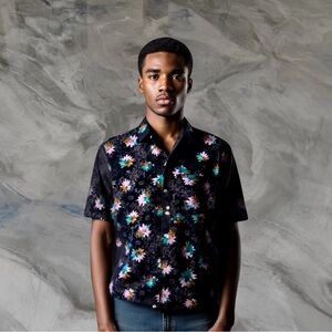 Bold black shirt with colorful floral design. Ideal for casual wear.