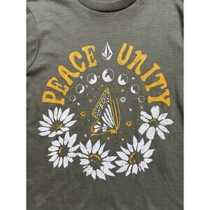 New with tags olive green long sleeved tee from Volcom in size XXS (4). Butterfly with daisies graphic on the front with the words “Peace and Unity”.