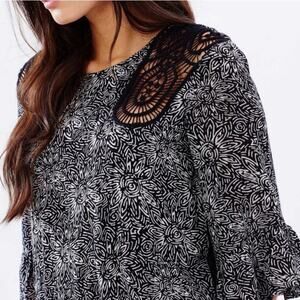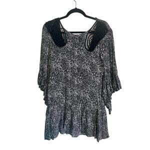 Volcom Stone Row Collection Whiskey Mountain Dress - Black and white sun pattern dress. Black lace panels at the front shoulders, back scoop, ruffle sleeve and hem, lined, back logo, mini length.