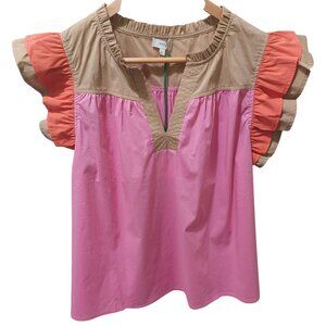 NWT Voy Kendra Colorblock Poplin Ruffle Sleeve Top In Pink~Khaki~Orange ~ SMALL