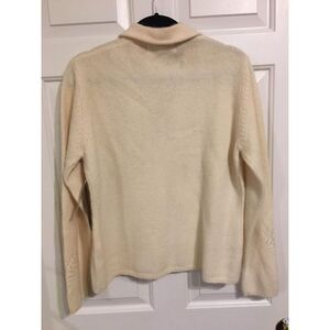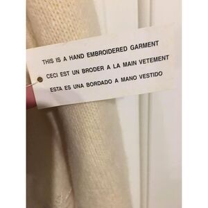 This Vintage lambs wool blend, please see pictures for details, was made in Hong Kong and has many features that will compliment any wardrobe. It's medium weight, cream on cream color has a shawl collar that is soft with a button down "Embroidered Fern" front and sleeves works with a dressed up look or with jeans and is perfect for the holiday seasons. Comfy and cozy for colder fall, winter into spring days it will complete your day and night looks. Measures are below.