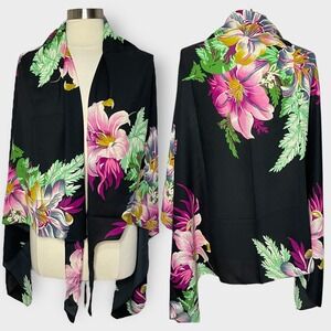Beautiful black sarong with large tropical floral pattern in fuchsia, white and green. Can be worn as a dress, skirt or shoulder wrap (all options presented in photos).