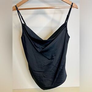 New with tags black camisole size Xs Cowl neck, low scoop back Sleeveless, adjustable spaghetti straps Asymmetric hem