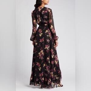 Painterly flowers and sparkly metallic threads bring glamour and artistry to an elegant dress in a wrap silhouette framed by semisheer long sleeves.