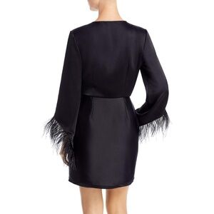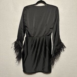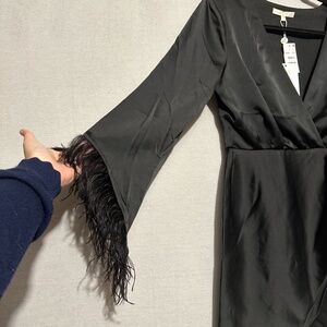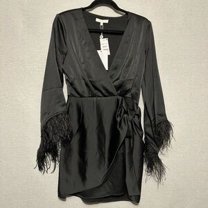 NWT Where Are You From mini dress with feather detail on the cuffs in black. Lined. V-neck. Faux wrap style. Asymmetrical sleeve with fun feathery trim. Size small.