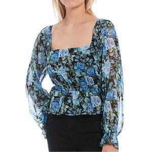 NWT WAYF Rose Floral Square Neck Blouson Sleeve Cut Out Back Smocked Peplum Top