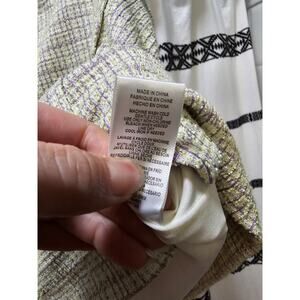 NWT WAYF light green and purple tweed corset style crop top with mini skirt set size large. Gold glittery thread throughout. Top has exposed brass zipper on front, shearing on the back. Skirt has invisible side zip, tiny slit over left thigh.