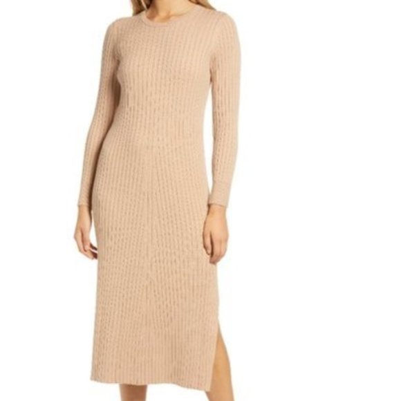 NWT WAYF x Dede & Emily Womens Tan Ribbed Knit Hollie Sweater Dress L LARGE