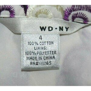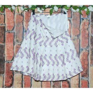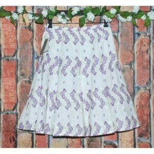 This NWT WDNY skirt features a vibrant white and purple embroidered design. The flare A-line cut & sequins add a playful touch. Perfect for a gypsy-inspired look. Size 4.