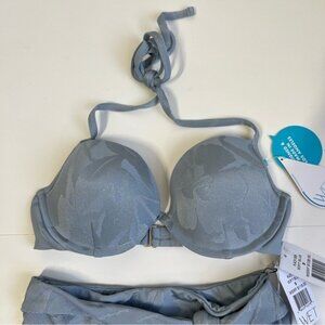 Stunning and flattering, featuring a padded halter bikini top and matching high-waisted bottom with tie belt detail. High-quality fabric with subtle floral texture and supportive fit. Original retail $226.