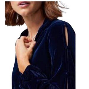 WHBM blue velvet blouse featuring a flattering V-neckline and elegant long sleeves with subtle slit and button details. Crafted from luxurious velvet fabric, this button-front top offers a sophisticated look perfect for both casual and dressy occasions