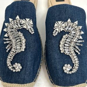 NWT WHBM Josi Denim Jewelled Seahorse Espadrille Slides Sz 10