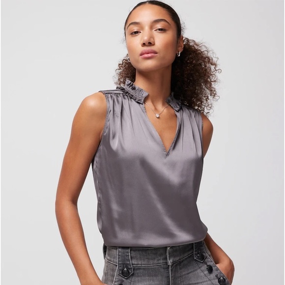We’ve added this satin ruched neck shell to our collection of sleeveless satin tops that seamlessly take you from work to after-work. The notch neckline is adorned with a ruffle for a feminine touch that will look perfect under a jacket.