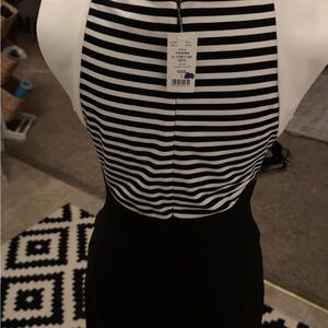 Chic sleeveless dress with black and white stripes. Elegant design with a keyhole neckline.