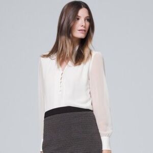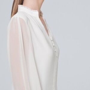This white Pintuck blouse is accented by meticulous pintucking design and and fabric covered buttons. The sheer chiffon sleeves lend gives off an ethereal feel on this Ecru woven blouse. Features: Sheer, stand collar with lace trim, sheer sleeves with button cuffs, curved hem, Color: Ecru. WHBM STYLE: 570279855 LS Ink Pntck blouse