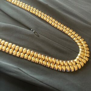 This is a lovely jet black long pantsuit in a size small and new with tags. The double gold and attached bead style necklace is attached onto the pantsuit. A zipper moves down the front center of the pantsuit. Although this is a size small, it does run large.