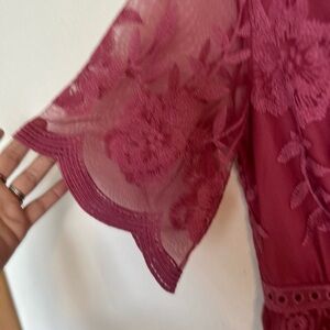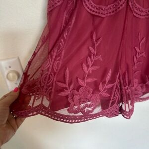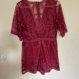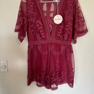 Bohemian inspired embroidered mesh lace romper. Deep V-neckline
