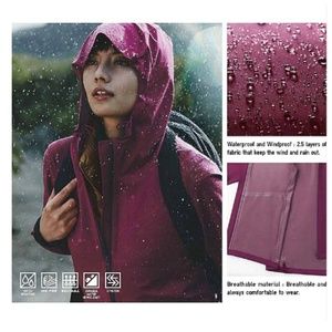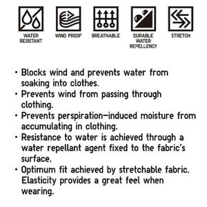High-tech design with waterproof, windproof, stretch, breathability, and durable water-repellent features.