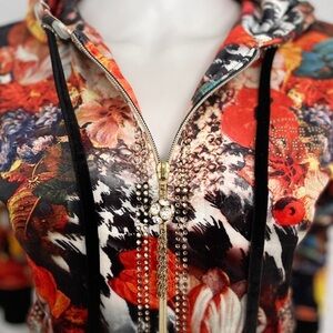 NWT WOMEN VELOUR TRACKSUIT SET JACKET/BLACK PANTS FLORAL PRINT LOUNGEWEAR HOODED