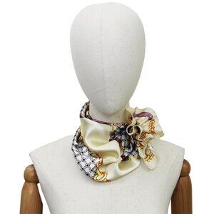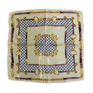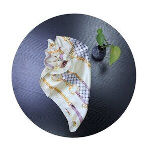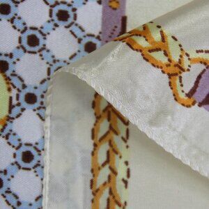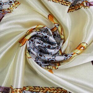 Elevate your style effortlessly with this chic satin scarf in pastel colors. The trendy chains and belts pattern adds a touch of sophistication to any outfit. This never used scarf has a vintage style, perfect for adding a unique flair to your wardrobe. Made from high-quality polyester satin, this scarf is not only stylish but also comfortable to wear.