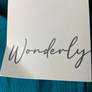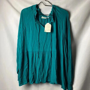 NWT WONDERLY WOMENS SIZE XL TEAL PEASANT WOVEN TOP RUFFLE COLLAR ELASTIC RUFFLE CUFFS TIE FRONT GAUZEY LOOK SOFT FLOWY LENGTH MEASURES APPROX 28” FROM SHOULDER TO HEM SLEEVES MEASURE APPROX 27 CHEST MEASURES APPROX 24” FROM SIDE TO SIDE NEW WITH TAG