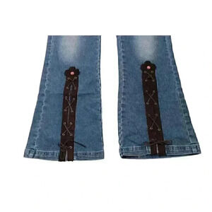 Step out in style with these brand new, never worn Women's 29 Y2K Faux Suede Lace Up Flower Denim Flared Jeans from O'Lico. The beautiful blue color and flower accents make these jeans perfect for any bohemian or cowgirl themed festival. The spandex and cotton material make for a comfortable fit, while the tie and button closure ensure a secure wear. These vintage-inspired jeans feature medium fabric wash with a denim fabric type that adds to its rugged appeal. The jeans are designed for regular size types and will be a perfect fit for someone looking for a stunning and fashionable pair of jeans. Get them today and make a statement wherever you go!