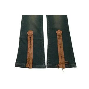 NWT Waist Size 31 Y2K Dark Wash Lace Up Flower Denim Flared Jeans Festival Boho