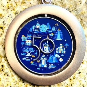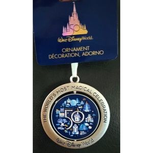 Brand new with tags. Walt Disney World Parks 50th Anniversary 4 Parks Mickey Spinner Ornament. Made of metal and features a satin ribbon for hanging.