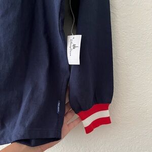 Walt Disney Wold USA Patriotic Mickey Spirit Jersey Navy Blue cotton with red and white striped ribbed crew neck and sleeves
