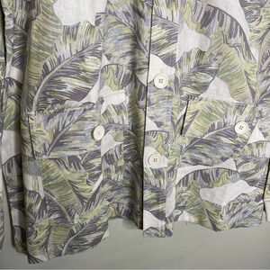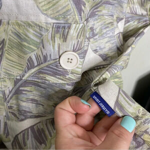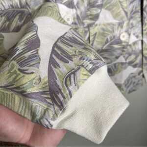 FEATURES: long sleeve; ribbed cuffs; tropical, Hawaiian print; linen/cotton blend; button front; button patch pockets; collared; Mickey head logo on front; Walt Disney World spellout across back
