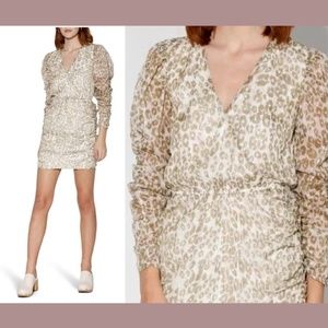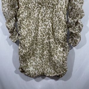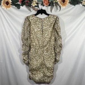 A timeless leopard pattern details this long sleeved woven dress, finished off with a ruched design.