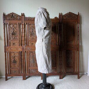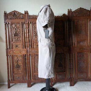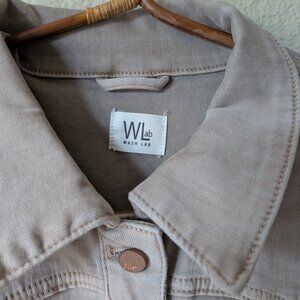 Beautiful, romantic grey beige color that's flirting with lavender but isn't actually purple. Flirty puff sleeve style with all the trappings of a denim jacket or jumpsuit with the large pockets and metal buttons. New with tags, no issues to note. Material provides stretch. Perfect for summer or fall.