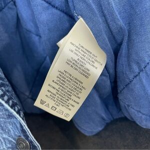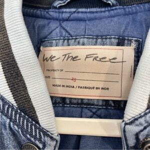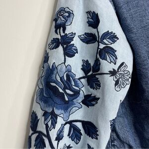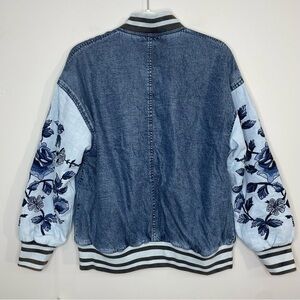 The perfect varsity-style, vintage jacket featured in a letterman-inspired design and slightly washed denim fabrication with contrasting, floral adorned embroidery on sleeves and striped detailing at hems for an added sporty touch.