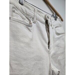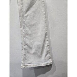 The white flare jeans feature a high-rise waistline and a zipper button front type. The fabric is made of 96% cotton and 4% spandex, providing a comfortable and stretchy fit.