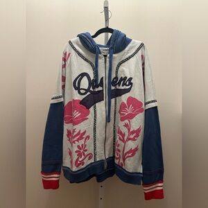 So unique from our We The Free collection, this one-of-a-kind hoodie features a printed design and embroidered detailing with a front-zip closure and drop-shoulder sleeves.