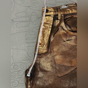 Features: Button closure, metallic denim fabrication, belt loops at waistband, 4-pocket style, subtle distressing, tapered bottom hem, seam detail throughout