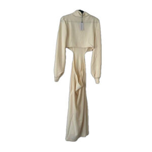 WEWOREWHAT, a brand by Revolve. Ivory knit A-line with long sleeves. The dress highlights your waist with sultry cutouts. Pull on style with turtleneck. 50” from shoulder to hemline.