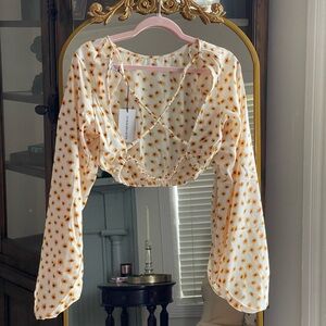 NWT WeWoreWhat Ditsy Billow Sleeve Boho White and Yellow Floral Daisy Print Cropped Open Back Blouse XS
