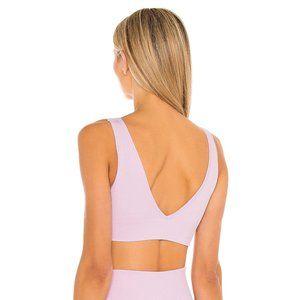 Stretchy ribbing at the sides enhances the fit of a stylish, seamless sports bralette with a deep V-neckline.