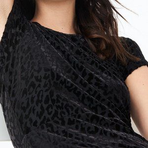 The velvet leopard print sits on a burnout background for a uniquely sassy look that pairs beautifully with booties and some statement jewelry.