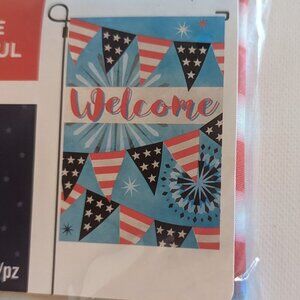Awesome NWT vertical Fourth of July 'Welcome' garden flag or sign with a design of criscrossing USA flag banners against a blue sky with fireworks, Michael's Celebrate It / Ashland 'Red, White & Blue' collection. This festive seasonal home decor fabric sign measures 12.5" x 18", and is new with tags /new in packaging. Garden flag is just the fabric portion, metal holder is not included. Perfect for an outdoor Independence Day holiday family reunion, barbeque or pool party decoration, or use by the house front door for a patriotic greeting all year long :)