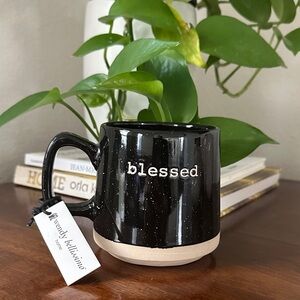 Charming mug with 'blessed' text. Black body with cream base. Perfect for any drink. Makes a great holiday gift for that special person!
